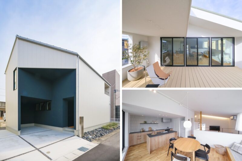 機能性とデザイン性を兼ね揃えたオープンガレージのある外観。