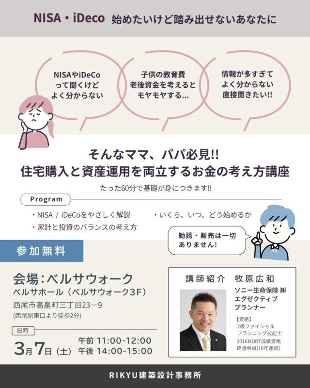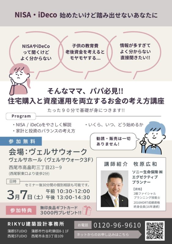 住宅の営業も行いません。まずは『家計の不安を解消すること』を最優先にした勉強会です。