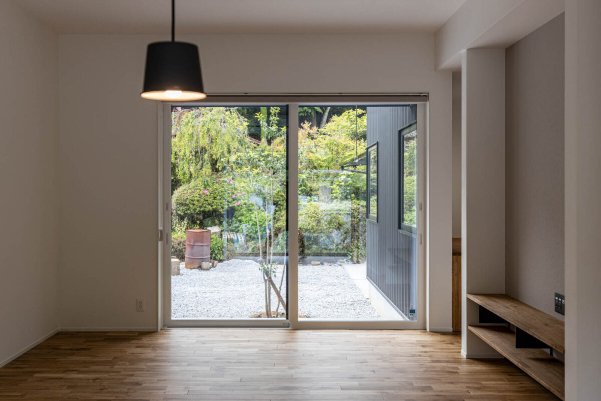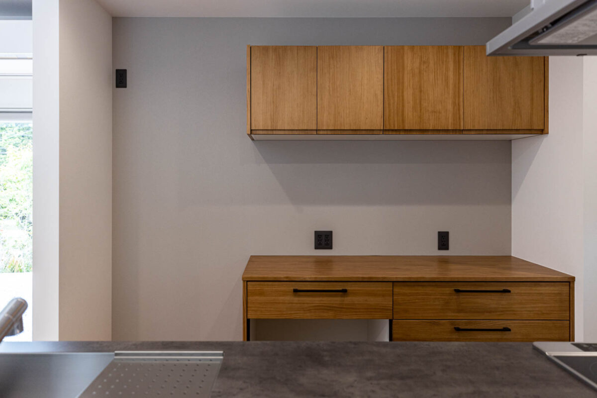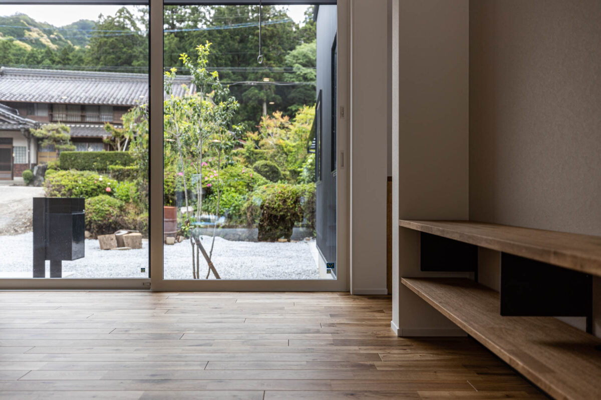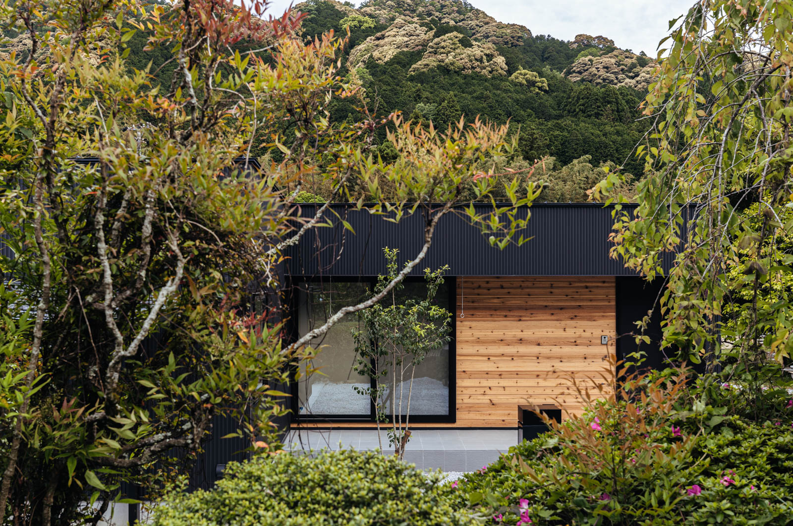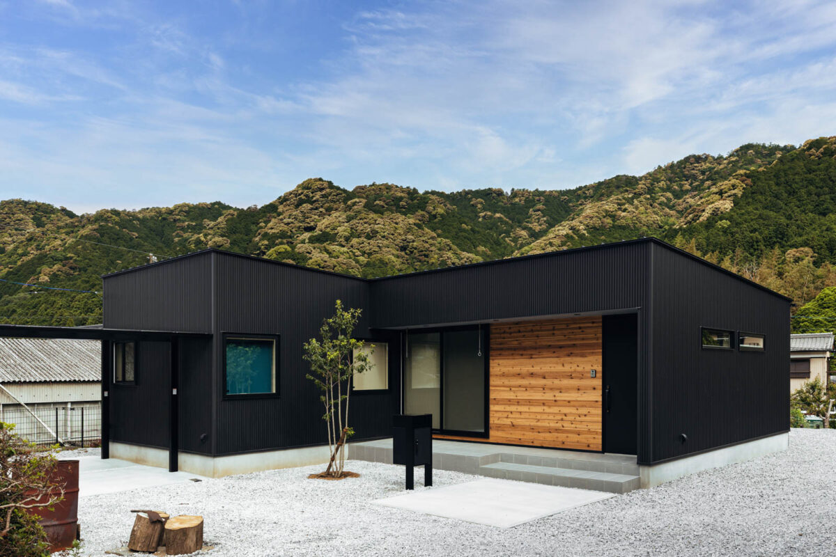 四季折々の山の表情になじむようシンプルな外観デザインとし、外壁はガルバリウム鋼板、アクセントにナチュレウォールを採用。玄関ポーチとテラスを繋ぎ、縦と横のラインに統一感を出しました。