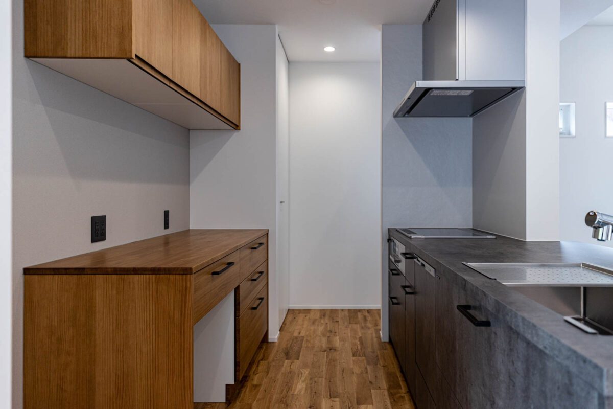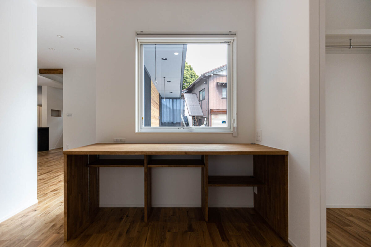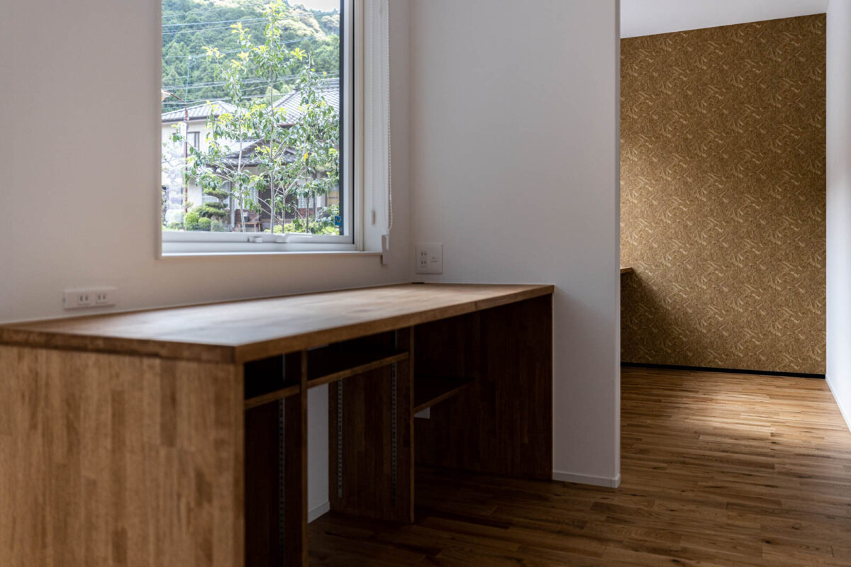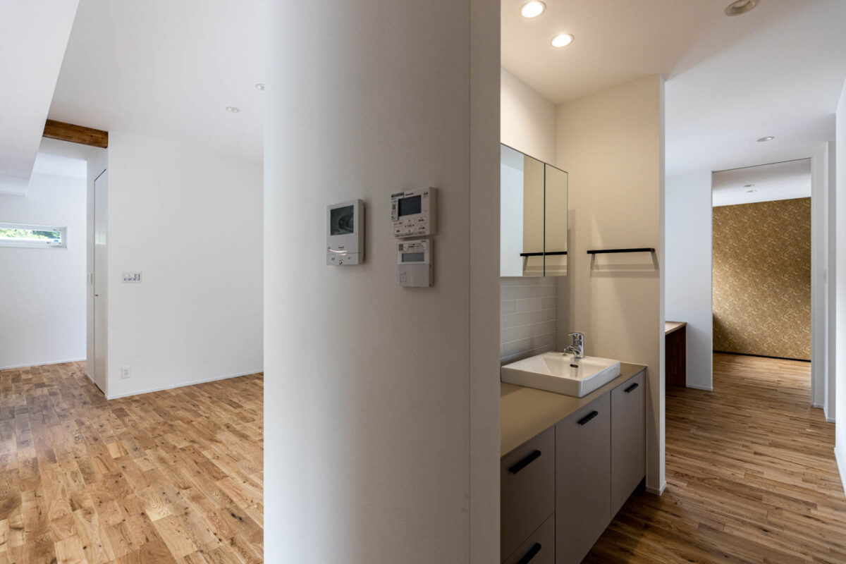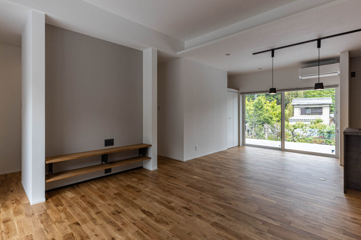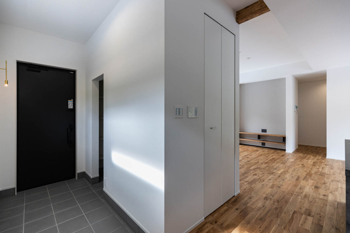 四季折々の山の表情になじむようシンプルな外観デザインとし、外壁はガルバリウム鋼板、アクセントにナチュレウォールを採用。玄関ポーチとテラスを繋ぎ、縦と横のラインに統一感を出しました。