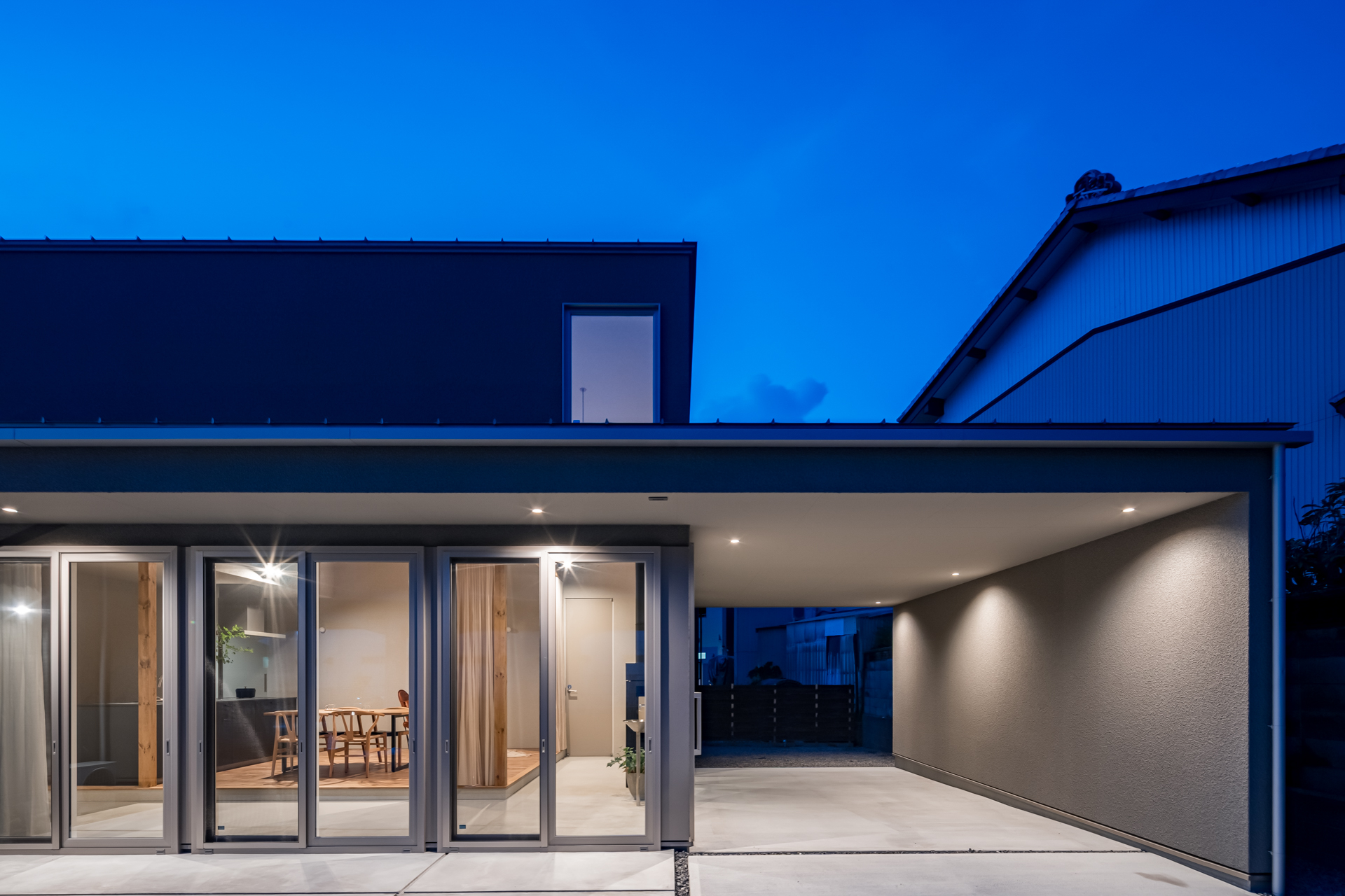 日が落ちると、住まいは昼間とはまた違った表情を見せてくれます。 やわらかな照明が外壁を照らし出し、穏やかな光が家全体を包み込みます。 大きな開口部からは室内のあたたかな明かりがこぼれ、 家族の笑顔や会話が外へとにじみ出るような雰囲気に。 街に対して閉じすぎず、安心感を保ちながらもひらかれた暮らしを感じられる佇まいです。 ガレージやアプローチにも計画的に照明を配置し、夜間の安心感と利便性を確保。 光と影が織りなす美しい陰影が、住まいに上質な雰囲気を添えています。