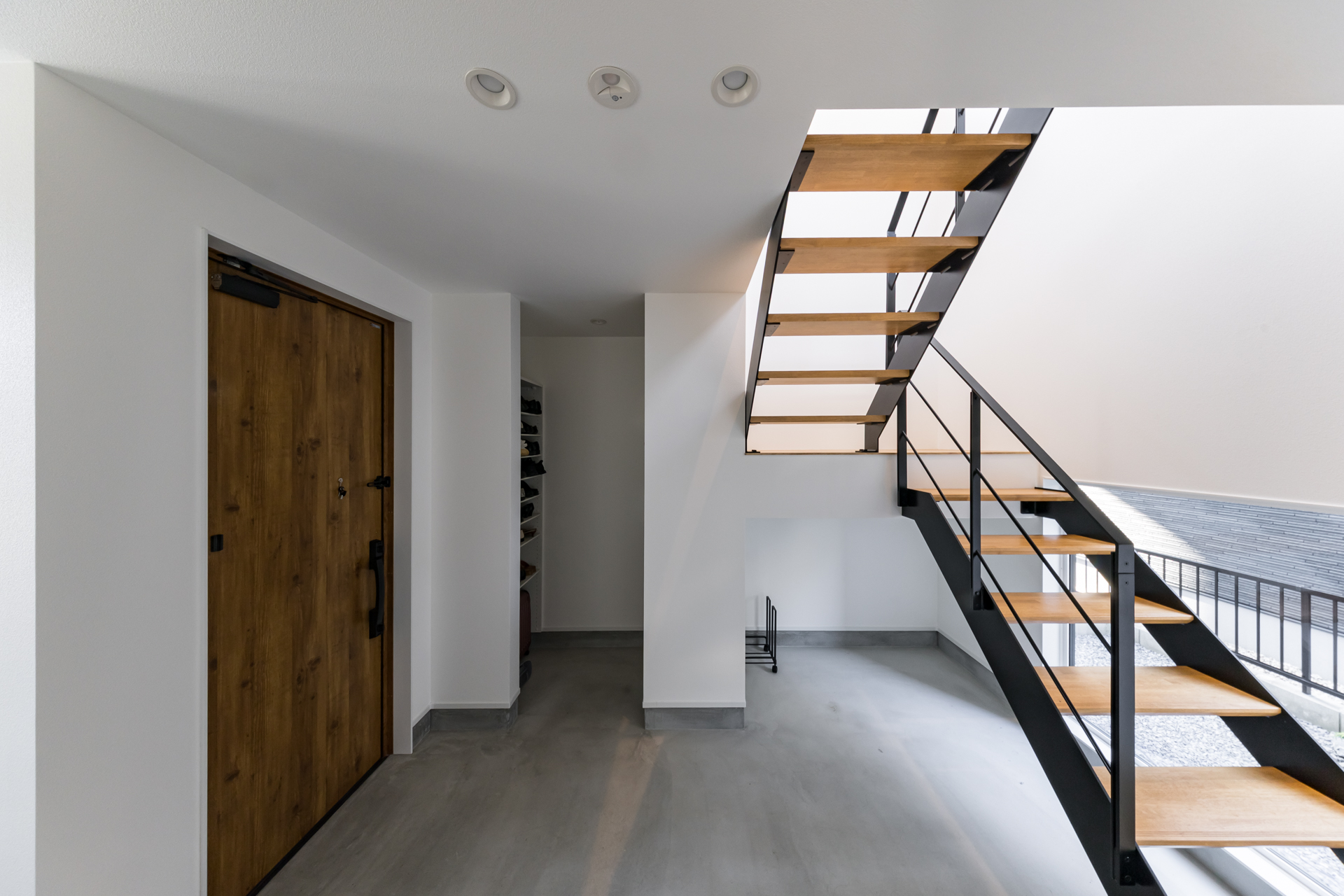 光が降り注ぐ、開放的な鉄骨階段のエントランス 上部の窓から光が落ちる明るい玄関は、鉄骨階段と地窓が奥行きを演出する美しい構成。 視線が外へと抜けることで、コンパクトながら開放感に満ちた「住まいの顔」となりました。