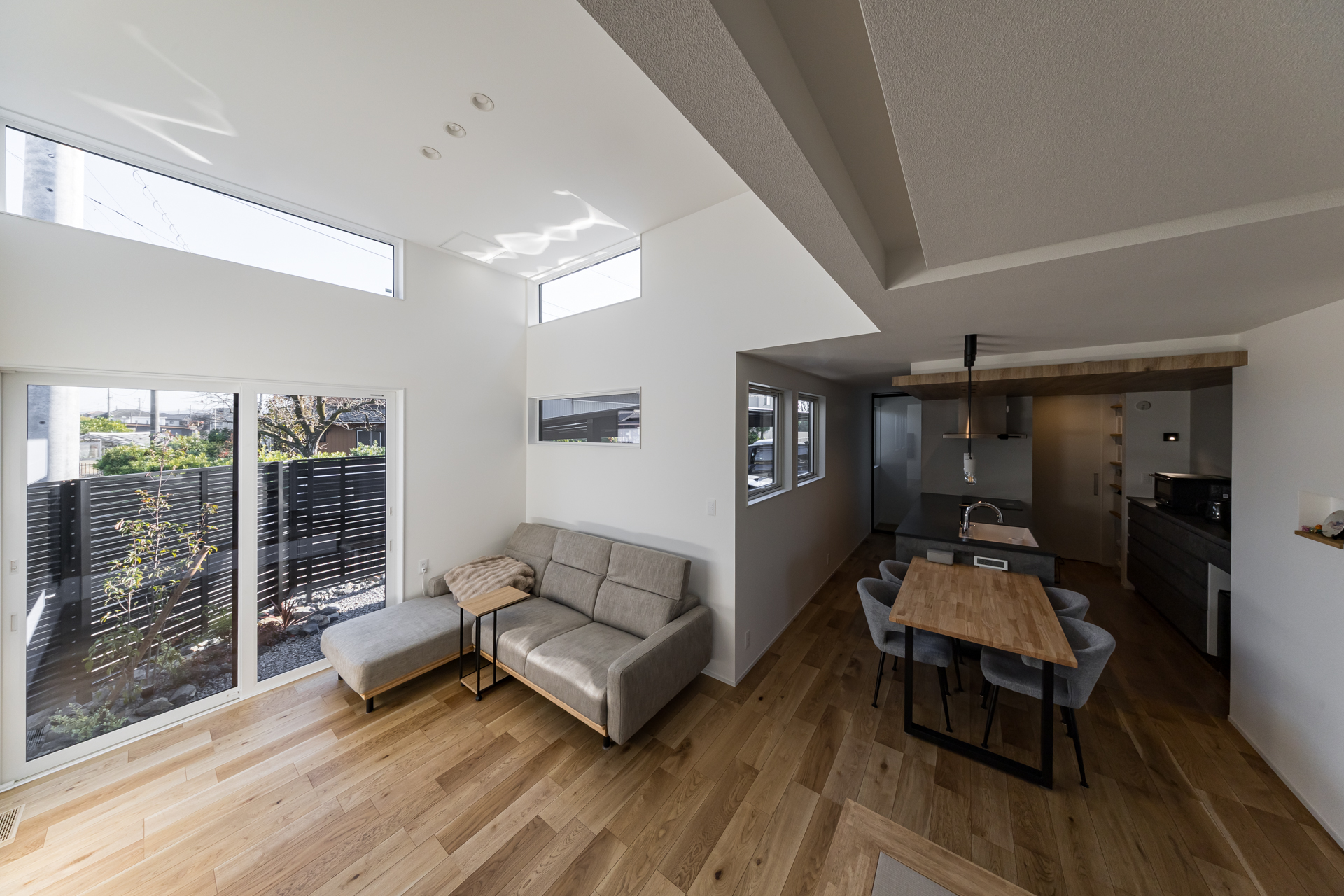 高天井から光が降り注ぐ、L字に繋がる大空間 高天井のハイサイドライトが、プライバシーを守りつつLDKの奥まで豊かな陽光を届けます。 キッチンからリビング、畳コーナーまでを見渡せるL字の配置が、家族の気配を感じる開放的な暮らしを実現しました。
