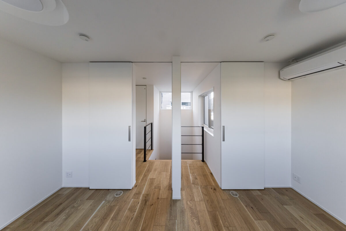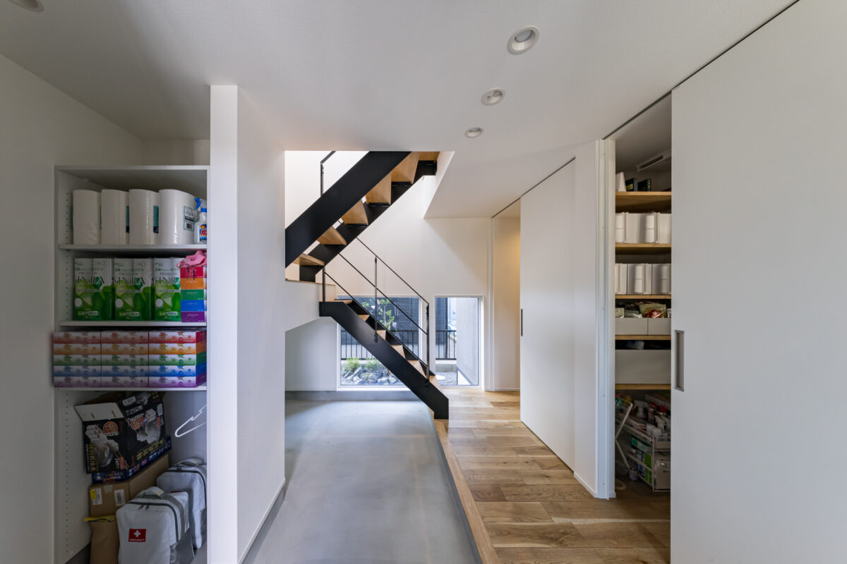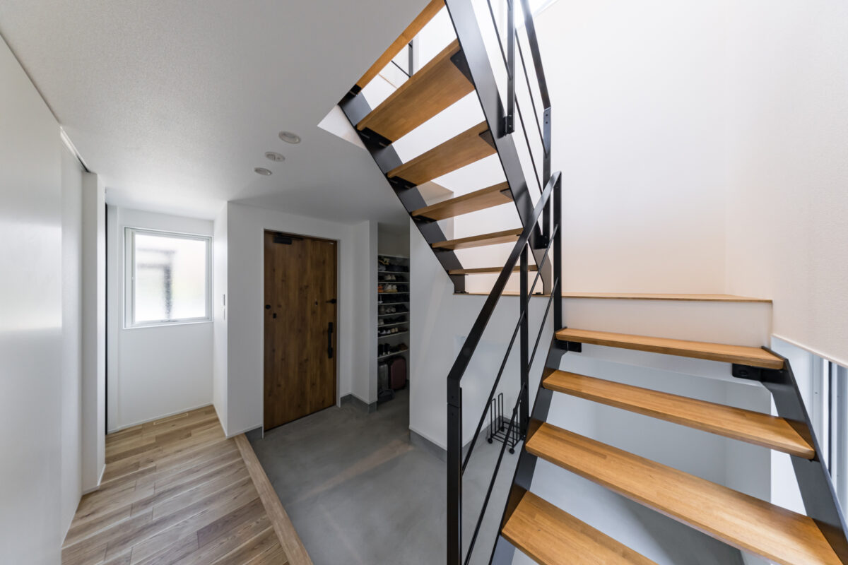 光が降り注ぐ、開放的な鉄骨階段のエントランス 上部の窓から光が落ちる明るい玄関は、鉄骨階段と地窓が奥行きを演出する美しい構成。 視線が外へと抜けることで、コンパクトながら開放感に満ちた「住まいの顔」となりました。