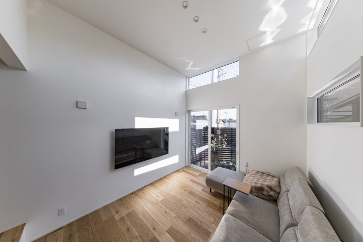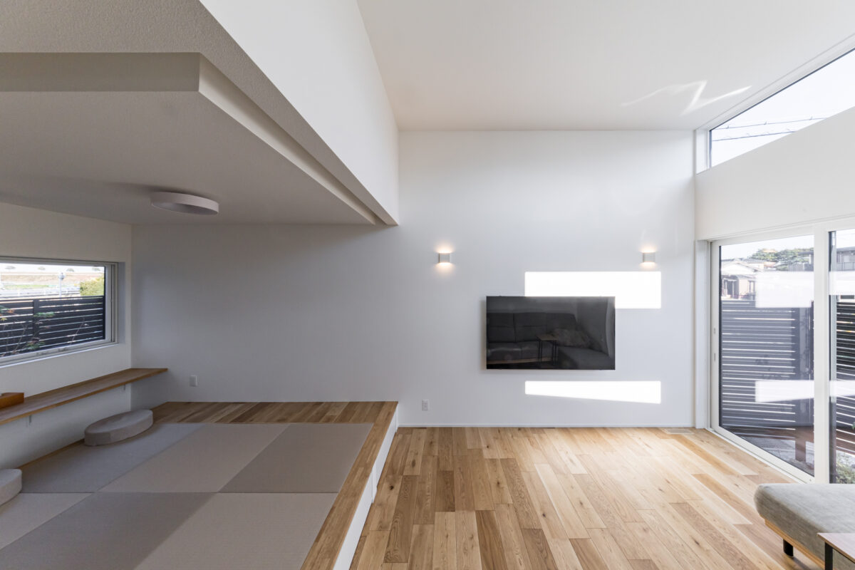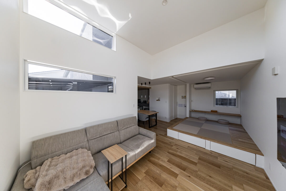高天井から光が降り注ぐ、L字に繋がる大空間 高天井のハイサイドライトが、プライバシーを守りつつLDKの奥まで豊かな陽光を届けます。 キッチンからリビング、畳コーナーまでを見渡せるL字の配置が、家族の気配を感じる開放的な暮らしを実現しました。