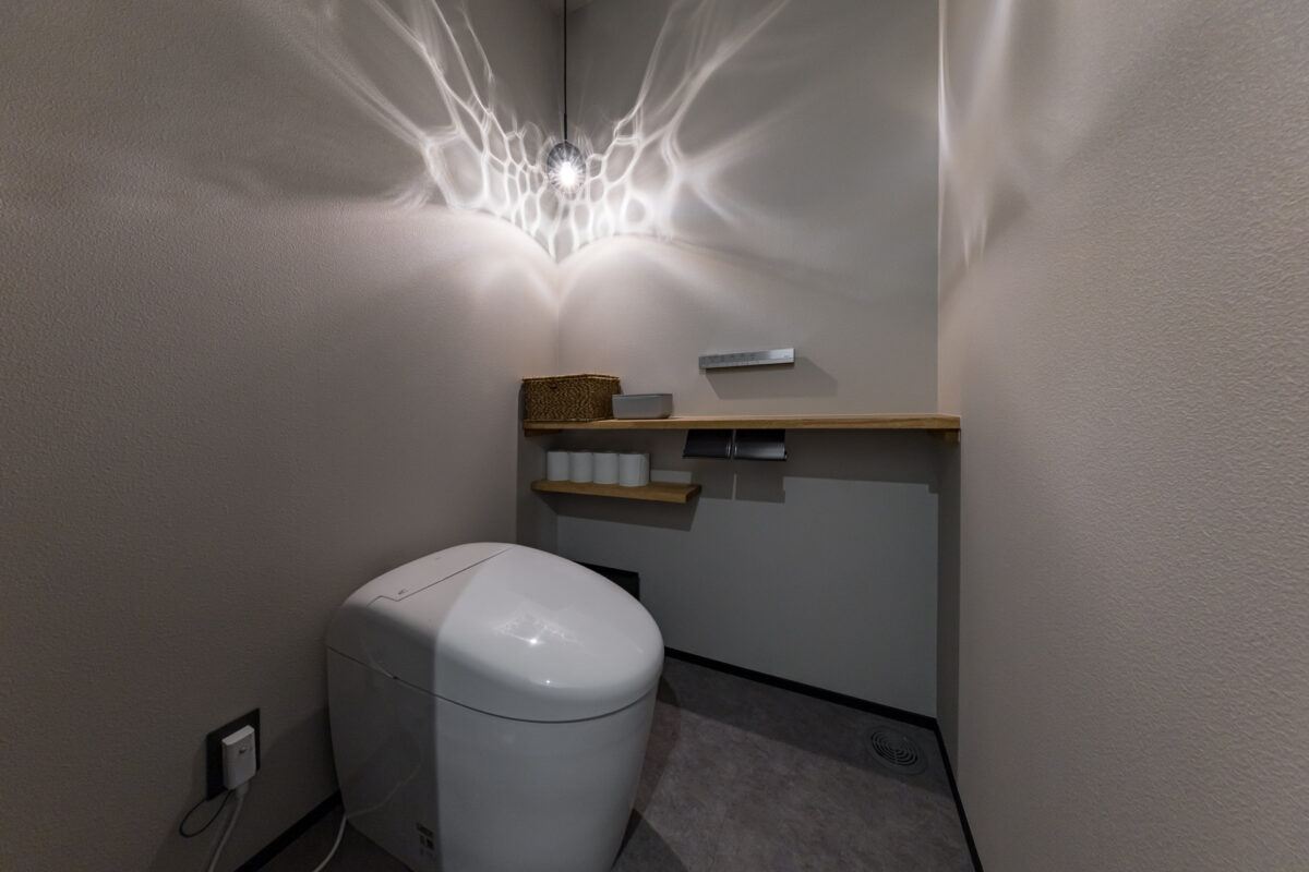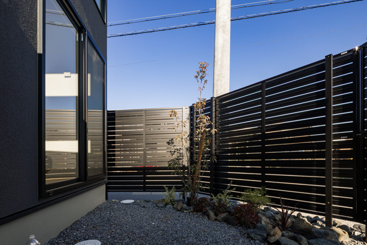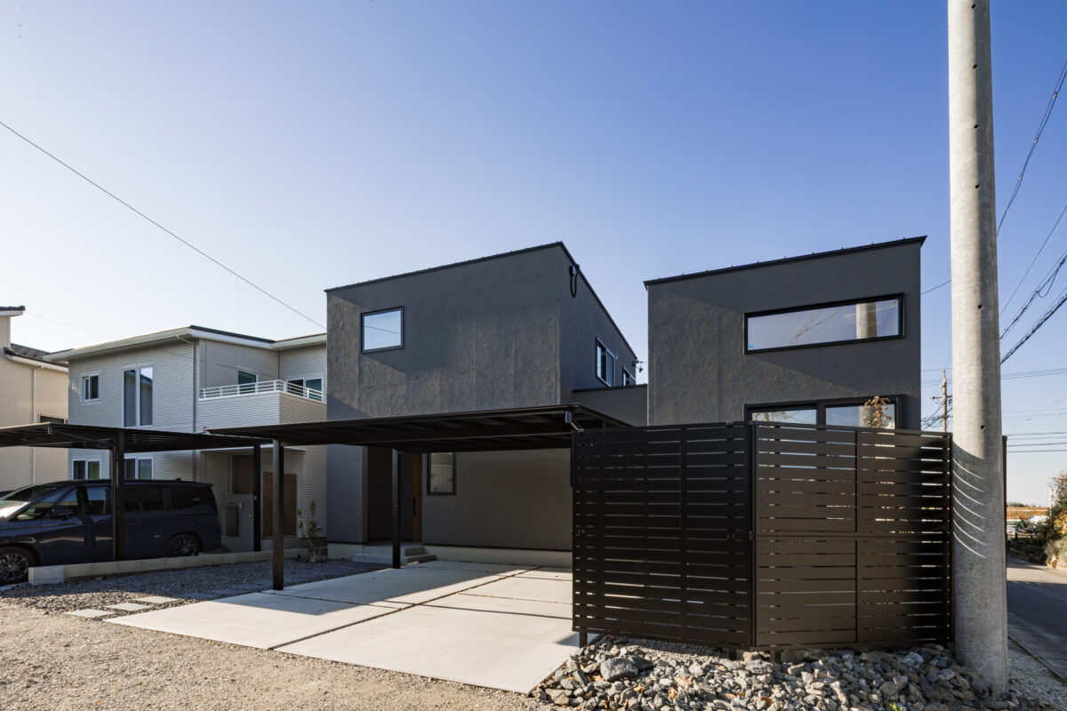洗練のグレーに包まれた、光を導く「鉤形」の造形 質感豊かなグレーの塗り壁が映える外観は、計算された「鉤形」の配置が特徴。隣家との距離を保ちつつ、LDKの奥まで陽光を招き入れる機能美をカタチにしています。